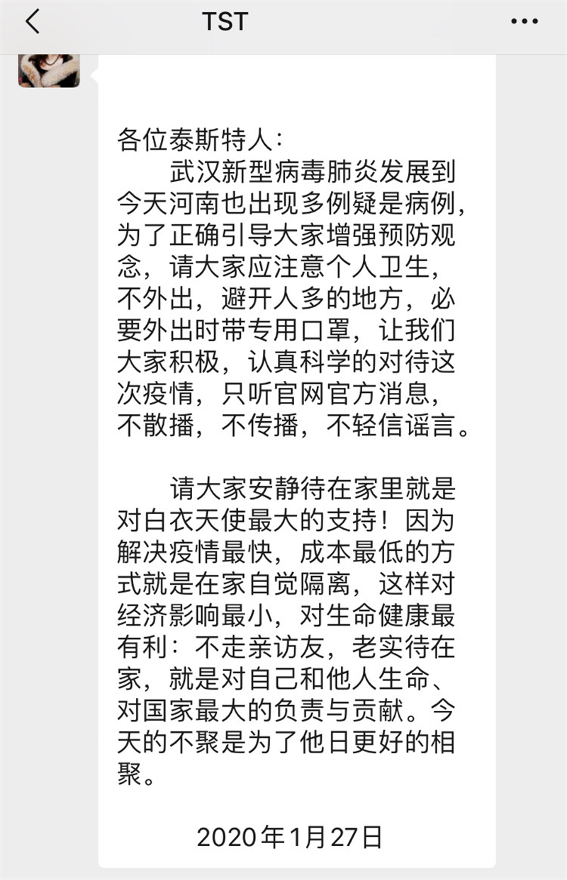 面向全體員工發布“告全體泰斯特人書”,統一全員思想,對抗疫情。