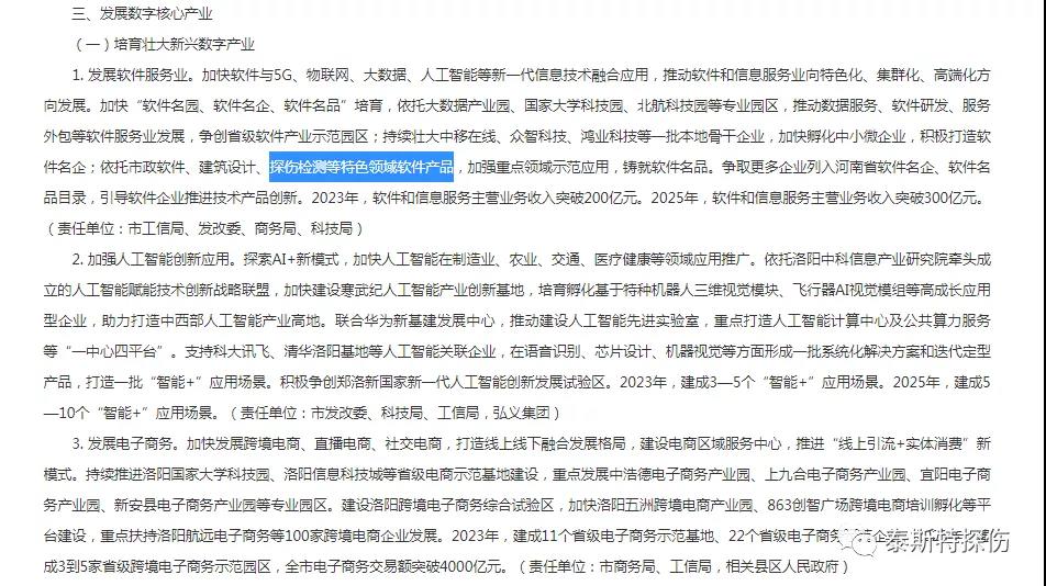 在《洛陽市數字化轉型行動計劃》中的第三項內容發(fā)展數字核心產業(yè),其中的發(fā)展軟件服務業(yè)講到加快新一代信息技術融合應用,推動軟件和信息服務業(yè)向特色化、集群化、高端化方向發(fā)展。加快“軟件名園、軟件名企、軟件名品”培育,依托專業(yè)園區(qū),推動數據服務、軟件研發(fā)、服務外包等軟件服務業(yè)發(fā)展,爭創(chuàng)省級軟件產業(yè)示范園區(qū);持續(xù)壯大本地骨干企業(yè),加快孵化中小微企業(yè),積極打造軟件名企;依托市政軟件、建筑設計、探傷檢測等特色領域軟件產品,加強重點領域示范應用,鑄就軟件名品。爭取更多企業(yè)列入河南省軟件名企、軟件名品目錄,引導軟件企業(yè)推進技術產品創(chuàng)新。