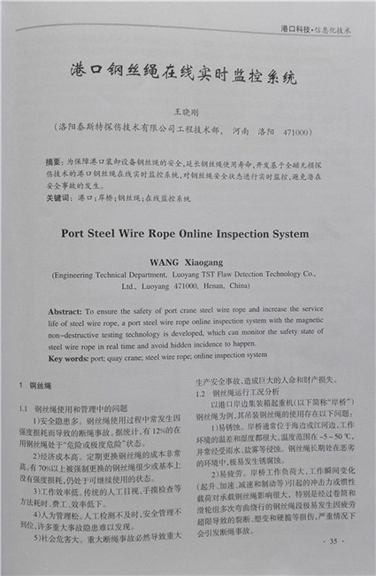 隨著公司新市場開拓不斷深入,市場反響逐漸升溫,尤其是面對港口行業(yè)對鋼絲繩安全問題關(guān)注度和解決方案渴求的急劇提升,針對港口行業(yè)的特殊工況環(huán)境和安規(guī)范要求,我公司和某港口達(dá)成戰(zhàn)略合作伙伴友好關(guān)系,為該港現(xiàn)場各類提升設(shè)備鋼絲繩提供安全監(jiān)測方案。豐富完備的港口現(xiàn)場數(shù)據(jù)和行業(yè)的鋼絲繩磁檢測技術(shù)結(jié)合成系列港口用鋼絲繩在線實時智能監(jiān)測系統(tǒng)。為了推而廣之向更多港口客戶提供TST產(chǎn)品保障安全的科技力量,同時也為了讓港口客戶對TST產(chǎn)品及技術(shù)方案在港口適用性有充分詳細(xì)的了解,TST 公司在港口行業(yè)權(quán)威性期刊《港口科技》2016年3月刊出《港口鋼絲繩在線實時監(jiān)控系統(tǒng)》論文。